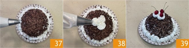 Finally, with a piping bag, create a border at the base 37 and decorative tufts on the surface 38, completing with three cherries placed in the center 39. Allow to cool in the refrigerator for at least an hour before serving your Black Forest zuccotto.