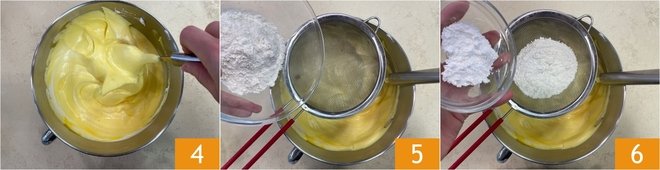 Mix gently 4, then sift the all-purpose flour 5 and the baking powder 6 into the batter.