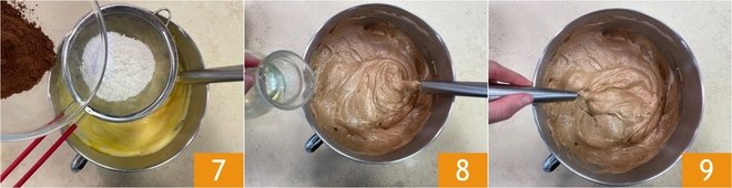 Also incorporate the sifted cocoa powder 7 and finally pour in the oil 8, always mixing with a spatula 9.