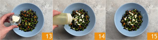 Finish with crumbled feta 13, a few parsley leaves, and a dash of oil 14. Your Black Venus rice with vegetables is ready to be enjoyed 15!