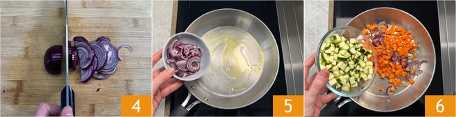 Clean and thinly slice the onion 4. Sauté the onion for 2 minutes in a pan with a dash of oil 5, then add the carrots and zucchini 6.
