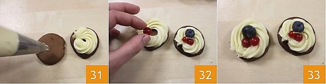 Move on to decorating the blinis: transfer the white chocolate cream into a piping bag and squeeze a tuft of cream onto each blinis, following the edge shape 31. Complete the decoration by placing your preferred berries in the center (32-33) and finishing with a fresh mint leaf. We placed a blueberry, a raspberry, a currant, and a mint leaf on each blinis, but you can decorate your Nesquik blinis with white chocolate cream as you like!
