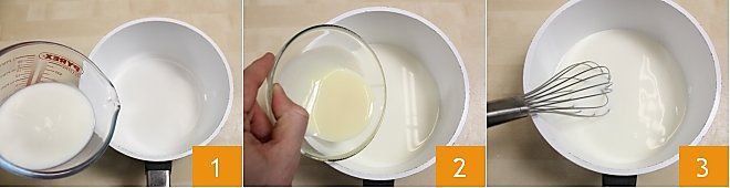 To prepare the Nesquik blinis with white chocolate cream, start with the cream: pour the cold milk into a small saucepan 1, then add Nestlé condensed milk 2 and mix everything with a whisk 3.
