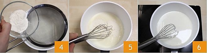 Add the sifted flour 4 and continue mixing with the whisk to dissolve the flour and avoid lumps 6. Now move the saucepan to the stove and bring the milk to a simmer, continuing to stir the mixture with the whisk 6
