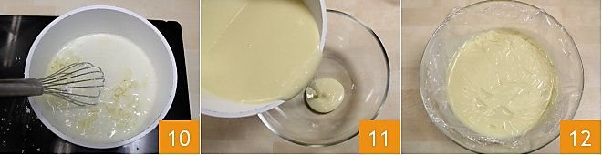 continue working with the whisk 10 until the chocolate is completely melted and the cream has reached a creamy and fairly firm consistency. Transfer the prepared white chocolate cream to a bowl 11, let it cool at room temperature, then store it in the refrigerator for at least two hours with a sheet of cling film touching the surface 12.