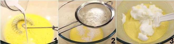To prepare the blinis, start with the basic batter: separate the yolk from the egg white and beat the yolk in a bowl, add the milk and cream little by little, mixing well to avoid lumps 1. Then add the sifted flour and baking powder and continue mixing 2. Let the batter rest for about an hour. Then add the egg white beaten to stiff peaks with a pinch of salt, being careful not to deflate it 3.