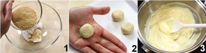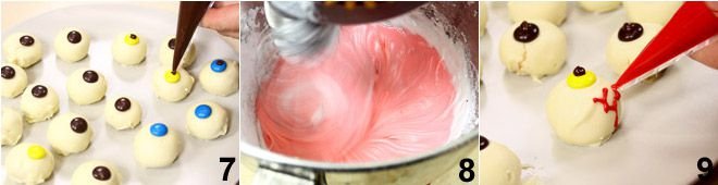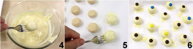 To prepare the bloody eyes, start by mixing the ricotta with the crushed cookies in a bowl 1, add 50 g of white chocolate that you have melted in a double boiler (or in the microwave) and cooled slightly. Stir vigorously with a wooden spoon to mix all the ingredients well. With this mixture, form balls with a diameter of about 1 1/4 inches, slightly flattened 2, and place them on a tray covered with parchment paper, put in the freezer for 15 minutes to set and harden. In the meantime, melt the remaining white chocolate in a double boiler 3 (or microwave) until it is fluid enough to be used as a coating.