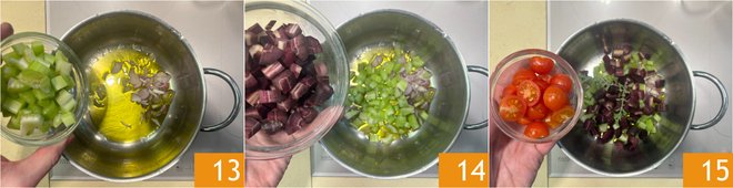 Start with the broth: in a pot with a drizzle of oil, add the shallots and celery 13. Add the carrots 14, marjoram sprigs, and cherry tomatoes 15. Sauté for a few minutes.