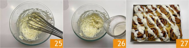 Remove the swirls from the oven and let them cool down 22. Meanwhile, prepare the frosting: in a bowl, pour the cheese, sugar 23, and lemon zest 24.