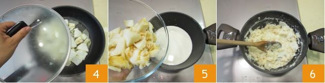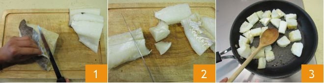 To prepare the boats with whipped cod, start with the latter. Remove the skin from the cod using a thin, smooth-bladed knife 1. Cut into large chunks and make sure there are no bones 2. Then in a pan where you have drizzled some oil, add the pieces of cod, let them flavor for a moment 3.