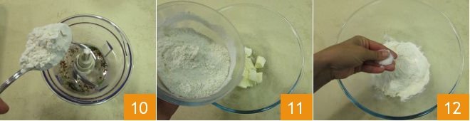 and 50 grams, taken from the total quantity 10. Turn on the machine and when everything is reduced to powder, add it back to the total amount of flour and mix. Then pour into a bowl with cold butter in chunks 11, add the salt 12.