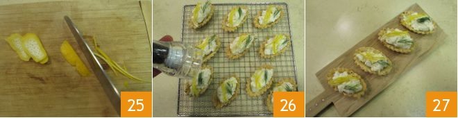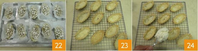 and small ceramic spheres 22 so you can proceed with blind baking. Bake in a static oven, already hot at 350°F, for about 30 minutes. Remove the spheres and parchment paper and bake for another 5 minutes, the time needed to brown the shortcrust pastry, before letting it cool and removing the boats from the molds; let them cool on a rack 23. Fill with the whipped cod by spooning it in 24.