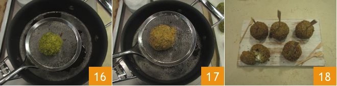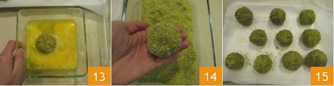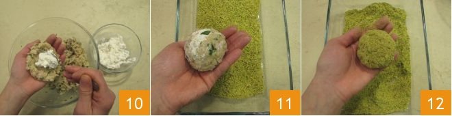 and place about 0.4 oz of sheep ricotta in the center 10. Close the meatball, giving it a round shape and ensuring the filling is well-sealed inside 11: with these quantities, you will obtain about 15 meatballs. Now pour the pistachio flour into one bowl and beat the eggs in another; roll each meatball first in the pistachio flour 12,