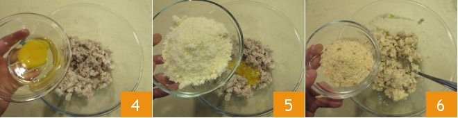 Transfer the minced meat into a bowl and add the egg 4, the Parmesan cheese 5, the breadcrumbs 6, and mix everything well.