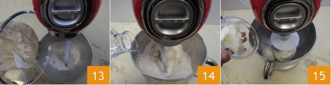 Add the biga 13 and begin mixing with the paddle while gradually adding the room temperature water 14. Let it run until you have a homogeneous dough. Then replace the paddle with the hook attachment and continue kneading for an additional 5 minutes. Next, divide the room temperature lard into two parts: add one part 15 and when it is completely incorporated into the dough, add the second. Let the mixer run for another 7-8 minutes.