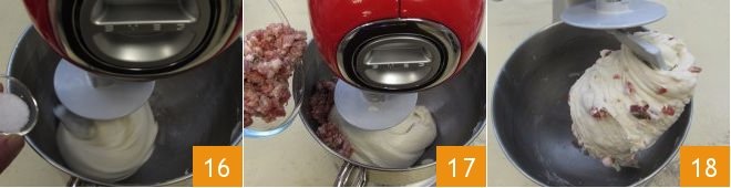 At this point, add the salt 16 and knead for 1 minute until it is completely absorbed into the dough. Also add the ham and bacon 17 and continue kneading for another 2-3 minutes: the dough should end up wrapped around the hook 18. Let it rest inside the mixer, covered with transparent plastic wrap, for about 15 minutes. After this time, give the dough 3 strengthening folds and let it rest for another 15 minutes. Repeat the operation two more times, each 15 minutes apart.