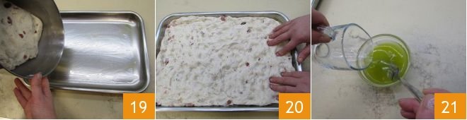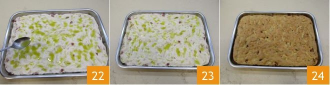 Finally, oil a pan of 16.5x11.8 inches and place the dough inside 19: spread it with your hands, applying gentle pressure with your fingers on its surface so that it is evenly distributed in the pan 20. Then mix the oil with water and create an emulsion by shaking the two liquids with a fork 21.