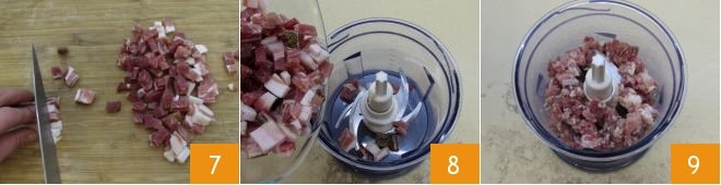 Cut the smoked bacon into cubes as well 7. Add both the ham and bacon to a mixer and blend 8: the chopped cubes should be fine 9 but not completely mashed. Temporarily set aside.