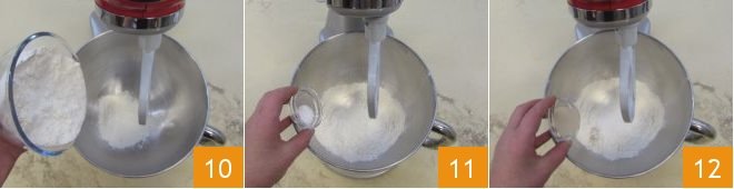 Now proceed with the dough: in a stand mixer, add the sifted flour 10, the sugar 11, and the dry yeast 12.