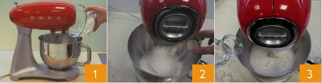 To prepare the Bolognese rising, start by making the biga: in a stand mixer with a hook attachment, add the sifted flour 1 and the dry yeast 2. While you begin mixing at medium speed, add the room temperature water gradually 3.