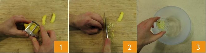 To prepare the limoncello Bombardino, start with the lemon. After washing and drying it well, use a peeler to obtain two zests 1 and from these create strips as thin as possible 2. Immerse them in a chilled bowl containing ice water and leave them there 3.