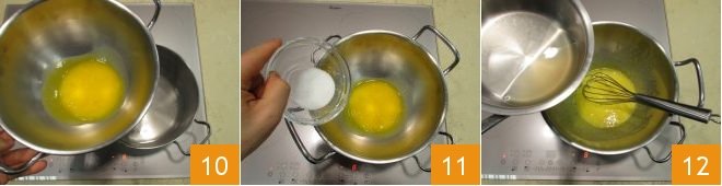 Meanwhile, place a mixing bowl over a pot of water, ensuring the bottom of the bowl doesn't touch the liquid 10. Turn the burner to medium heat and add the egg yolks and the remaining sugar 11, pour in a splash of the syrup and start whisking 12.