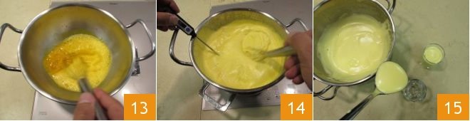 and the limoncello 7, add about half of the sugar 8 and then turn on the burner at a low temperature. Stir continuously until the sugar is completely dissolved 9.