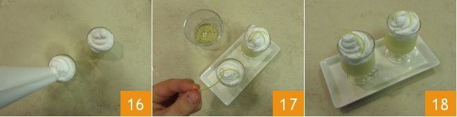 Now cover the limoncello zabaione with the whipped cream. Try not to place it directly on the cream as it will sink. Instead, form a sort of garnish around the glass 16 and then squeeze more cream to form a small spiral 17. This way, you will prevent the cream from sinking, making the liquid beneath spill out. Complete your limoncello Bombardino glasses with a couple of lemon zests and drink them while still hot 18!