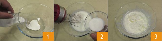 To make the Bombardino, first whip the cream: pour the cold cream into a bowl 1 and start beating with an electric mixer while gradually adding the sugar 2 until you achieve a firm and stiff consistency 3. Transfer the whipped cream to a piping bag with a star tip.