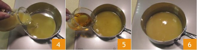 Now pour the Vov into a small pot 4 and heat it over low heat for 5 minutes, then add the brandy 5 and turn off the heat, slightly swirling the pan to mix 6.