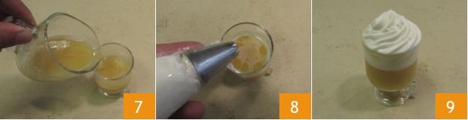 Fill the glasses with the liqueur up to about two-thirds 7, then add the whipped cream 8. Your Bombardino is ready to be enjoyed 9!