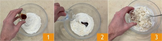 Start by preparing the Genoese focaccia: in a bowl, pour the flour, the malt 1, and half of the water 2. Start kneading with a fork; once the liquid is absorbed, add a little more water and the crumbled yeast 3.