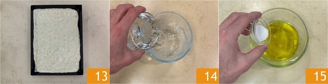 It should cover the entire surface; if the dough is too elastic, cover it again with plastic wrap and let it rest for another 15 minutes. Once spread, the focaccia should rise for 2 hours in the turned-off oven with the light on. Meanwhile, prepare the brine: in a bowl, pour the water 14, the oil, and the salt 15.