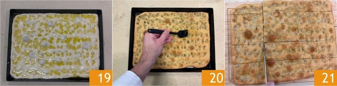 Let it rise for another 15 minutes at room temperature 19. Bake in a preheated static oven at 464°F (240°C) for 18-20 minutes. Once baked, remove it from the oven and brush the surface with the reserved brine 20. Finally, cut the Genoese focaccia into strips and set it aside 21.