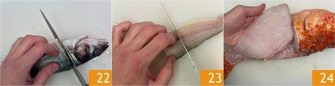 To prepare the bouillabaisse, start by cleaning the fish, being careful to keep all the scraps. How to clean the seabass: remove the head 22, cut along the back, and gut it, then fillet it 23, remove the bones, and cut the fillets into small pieces 23. How to clean the scorpionfish: remove the fins and head, fillet it 24, and remove the belly.