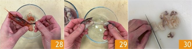 How to clean shrimp: remove the shell, leaving the head and tail, then extract the intestine and set them aside 28. Finally, Cleaning Squid, removing the internal cartilage and innards 29, then cut them into strips 30.