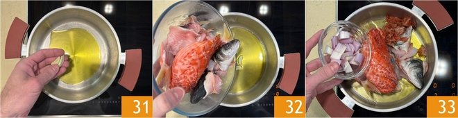Prepare the Fish Stock: in a saucepan, pour a drizzle of oil and the garlic with the germ removed 31, add all the fish cleaning scraps 32, and the peeled and chopped shallot 33.