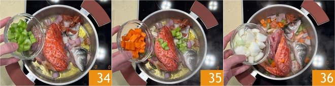 Also add the rest of the cleaned and chopped vegetables: the celery 34, the carrots 35, and the onion 36.