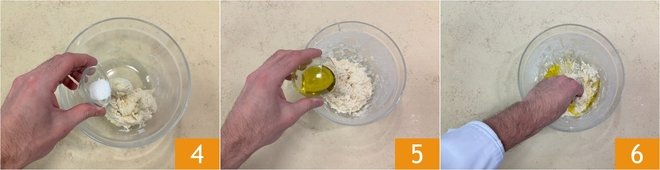 Continue mixing, slowly adding the remaining water. Now add the salt 4 and half of the oil 5, then start kneading by hand 6.