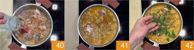 Cover with water 40 and stir to dissolve the paste 41, then season with aromatic herbs: basil, marjoram, and thyme 42.