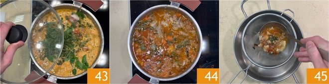 Cover with a lid and cook over low heat for 40 minutes 43. At the end of cooking 44, strain the stock 45 and keep it.