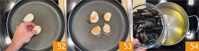 Place the scallops in the same pan 52 and brown them until golden 53. Set these aside as well. Handle the mussels: in a saucepan, heat a drizzle of oil, then add the cleaned mussels 54.