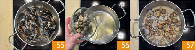 Cover with the lid and cook over high heat until they open 55. Do the same for the clams 56 and cook just until they open 57.