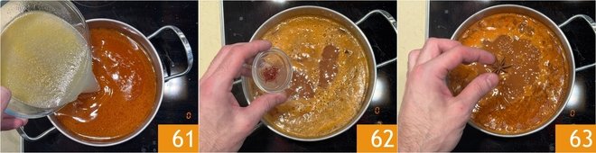 Now add 1 1/4 cups (300 g) of the mussel and clam cooking water to the stock 61, then return to the heat and flavor with saffron 62 and star anise 63.