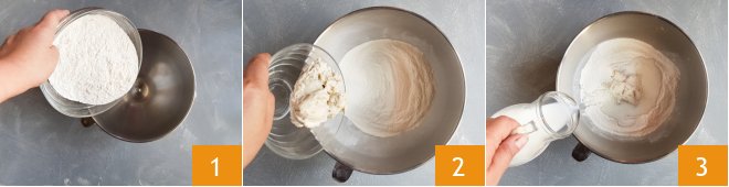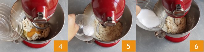 Incorporate the egg 4, the salt 5, and the sugar 6.