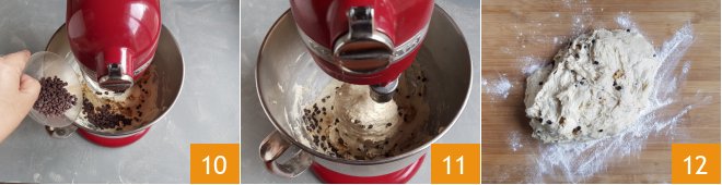 Finally, add the chocolate chips 10, work for a few moments to incorporate them 11. Transfer the dough onto a lightly floured work surface 12.