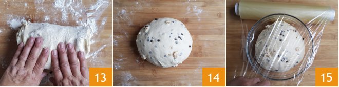 Knead by hand 13 to form a ball 14 and place it in a bowl. Cover with plastic wrap and let it rise for at least 4 hours, away from drafts 15.