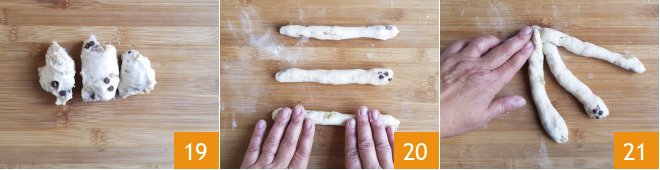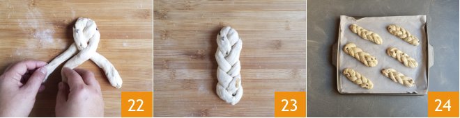 Braid the three ropes 22. You should get a classic braid 23. Line a baking tray with parchment paper and place the braids on top 24.