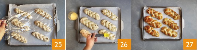 Cover with plastic wrap 25. Let the braids rise for at least 8 hours in a warm place. After this time, prepare a mixture of egg yolk and milk. Brush the already risen braids with the mixture 26 and bake in a preheated static oven at 356°F on the middle rack for about 25 minutes. Remove the well-golden braids from the oven and let them cool completely before consuming 27.