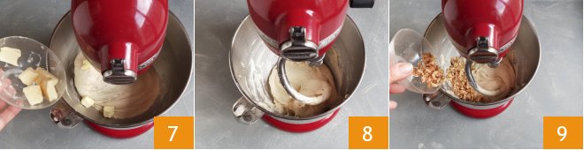 Then add the butter a little piece at a time 7, allowing the previous piece to be incorporated before adding the next. Work for at least 10 minutes. When the dough is well combined 8, add the coarsely chopped walnuts 9.